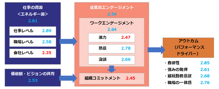 ●従業員エンゲージメントに影響を及ぼす要因:「仕事の資源」と「価値観・ビジョンの共有」