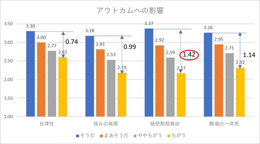 DXの恩恵とアウトカムの各要素には相関がありますが、特に、「継続勤務意欲」に関して、DXの効果を感じている会社とそうでない会社の差異が大きく見られています。
